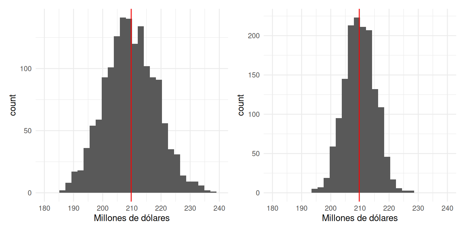 - Para entender qué tan buena es una estimación particular, entonces, tenemos que entender cuánta variabilidad hay de muestra a muestra debida a la aleatorización. Esto depende del diseño de la muestra y de la población de precios de casas (que no conocemos).