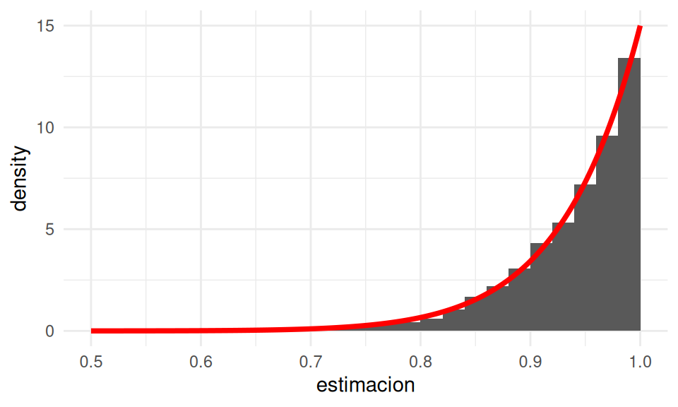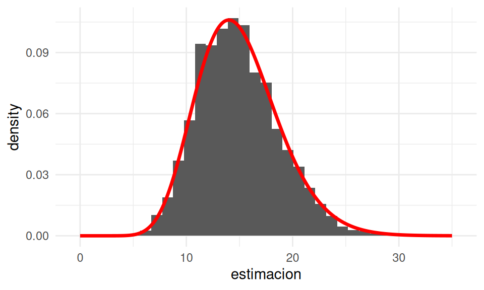 Y vemos que en efecto el TCL aplica en este ejemplo, y la aproximación es buena. Aunque la población original es sesgada, la descripción de la distribución de muestreo es sorprendemente compacta: