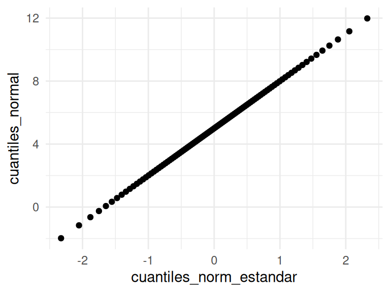 De modo que si graficáramos los cuantiles de una distribución \(\mathsf{N}(\mu, \sigma)\) contra los cuantiles de una distribución \(\mathsf{N}(0,1)\), estos cuantiles aparecen en una línea recta: