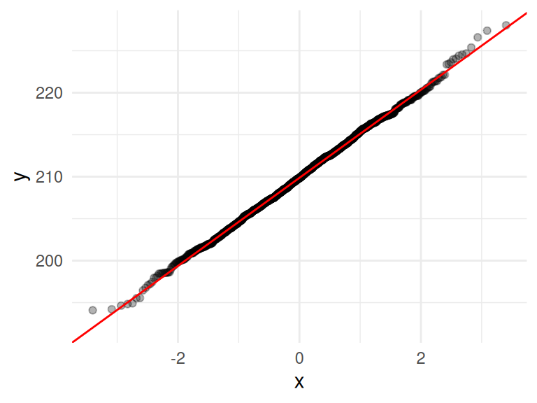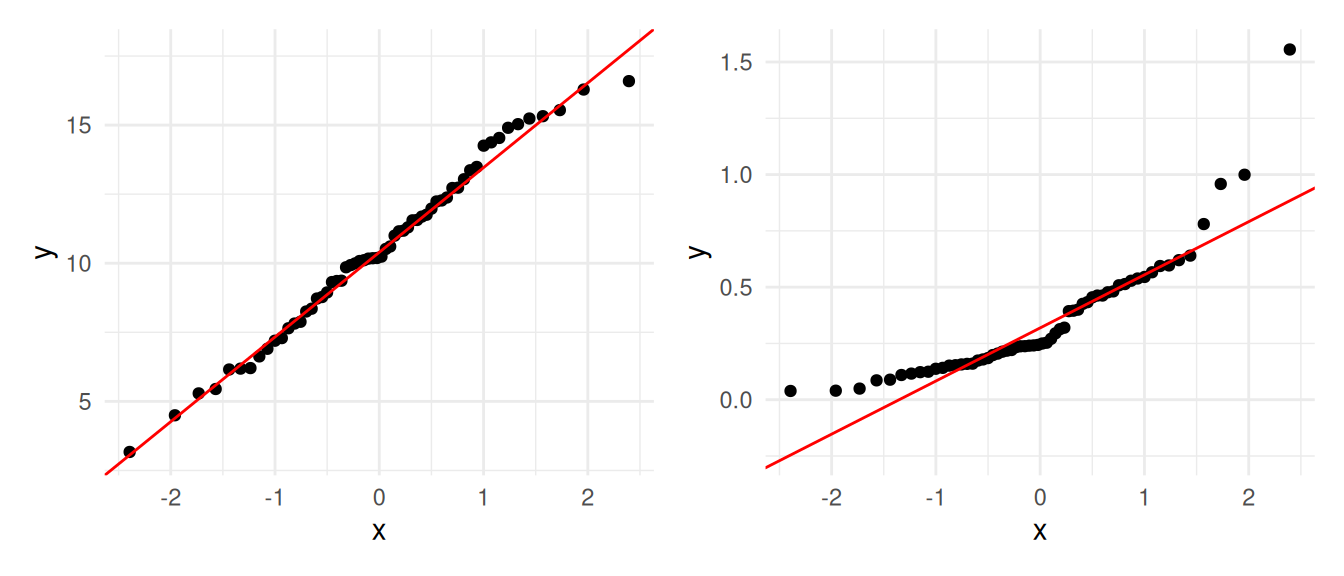 - Si la muestra tiene una distribución aproximadamente \(\mathsf{N}(\mu, \sigma)\), entonces sus cuantiles muestrales y los cuantiles respectivos de la normal estándar están aproximadamente en una línea recta.