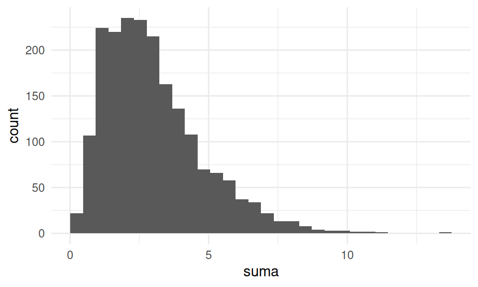 sims_gamma <- map_df(1:2000, ~ tibble(suma = sum(rgamma(30, 0.1, 1))),