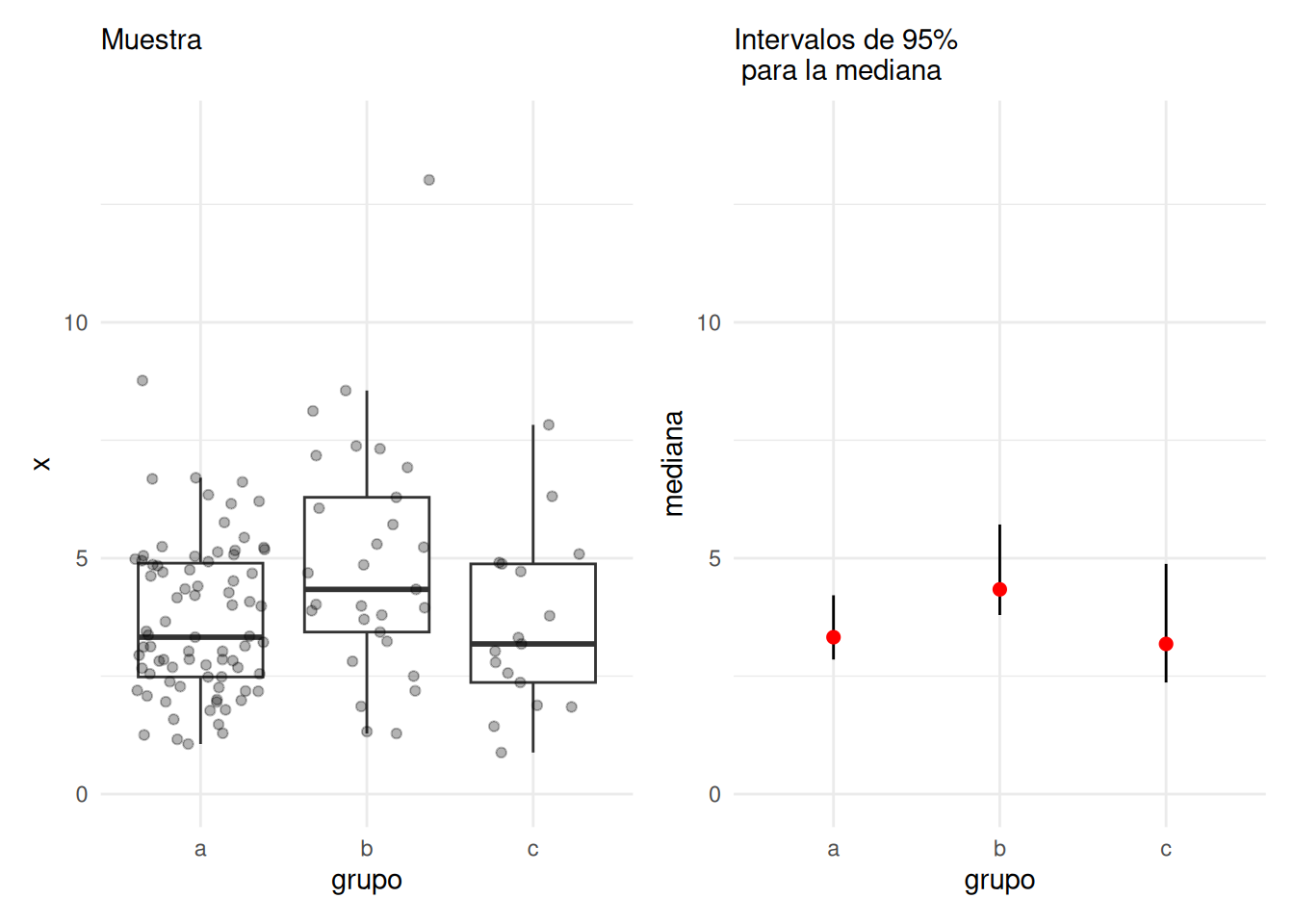 - En rojo está nuestra estimación puntual de la mediana de cada grupo (la mediana muestral), y