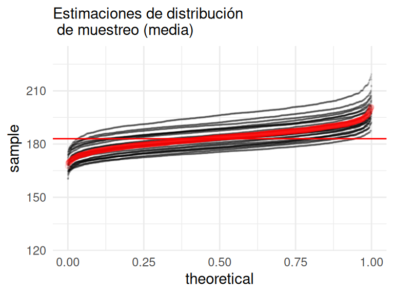 Como explicamos, el problema que tenemos ahora es que normalmente sólo tenemos una muestra, así que no es posible calcular las distribuciones de muestreo como hicimos en la sección anterior y así evaluar qué tan preciso es nuestro estimador. Sin embargo, podemos hacer lo siguiente: