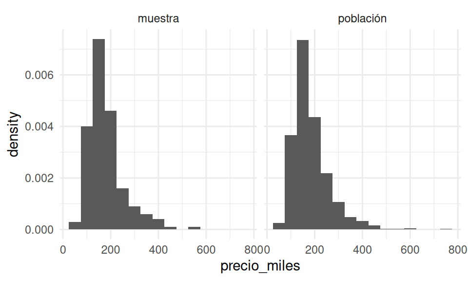 summarise(media_precio = mean(precio_miles), .groups = "drop") |> pull(media_precio)) Y nuestra estimación de la distribución de muestreo para la media es entonces: