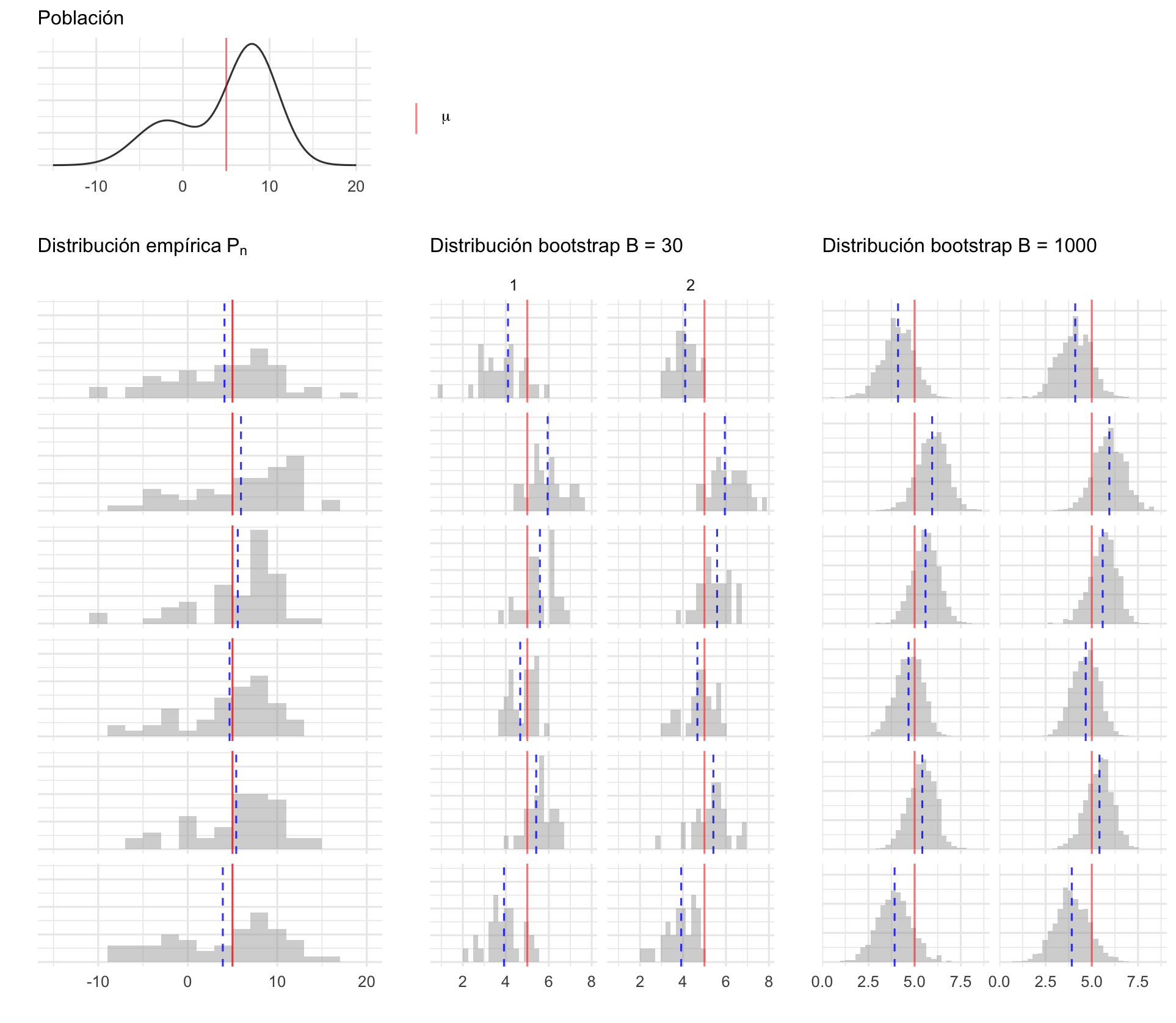 - Si tuviéramos la distribución poblacional, simulamos muestras iid para aproximar la distribución de muestreo de nuestro estimador, y así entender su variabilidad.