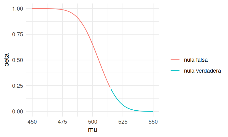 Es decir, si la media \(\mu\) de la ciudad es muy baja, con mucha seguridad rechazamos. Si es relativamente alta entonces no rechazamos. El tamaño de la prueba es el mayor valor de probabilidad de rechazo que se obtiene sobre los valores \(\mu\geq 515\) (la nula). Podemos calcularlo analíticamente como sigue: