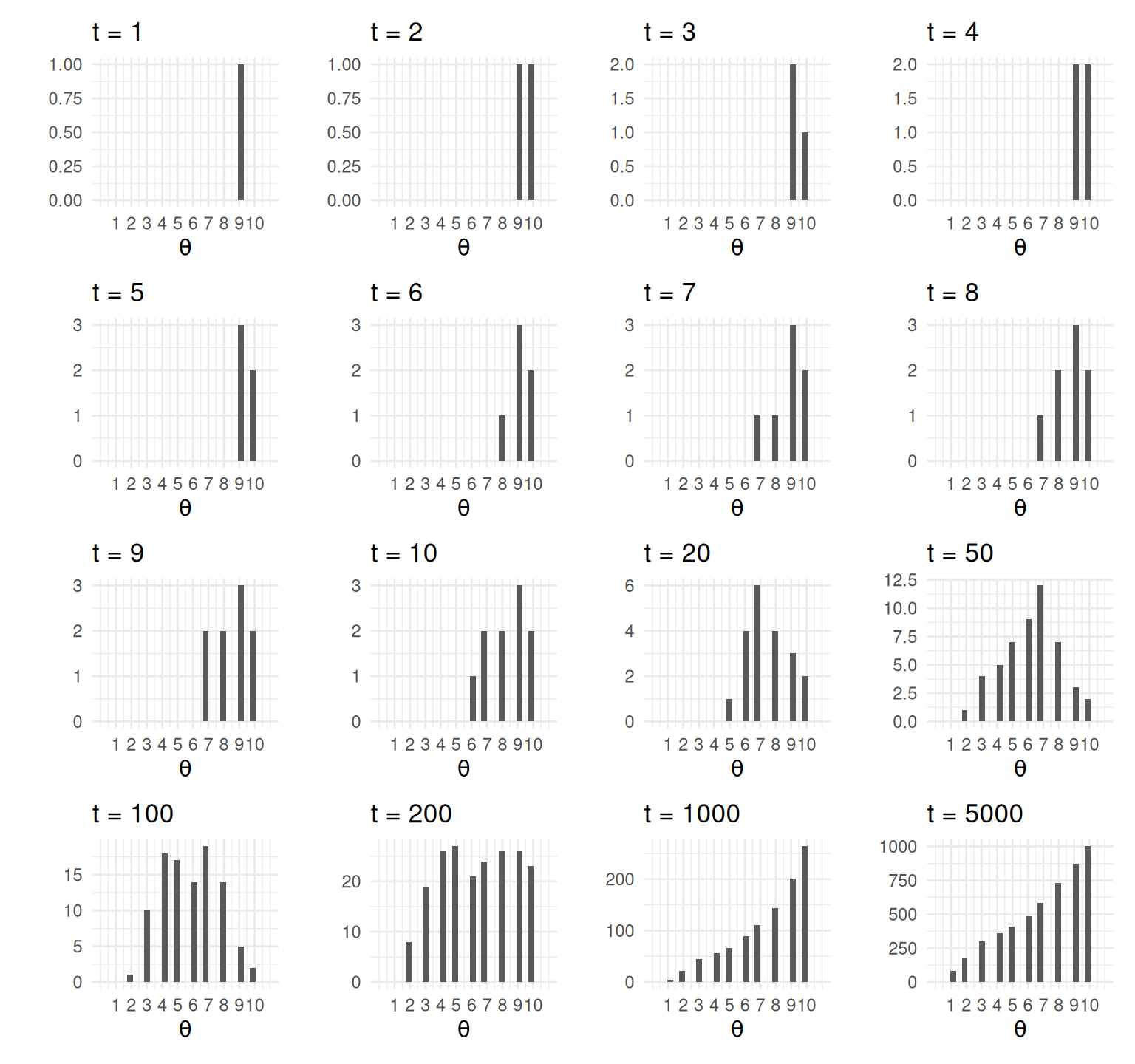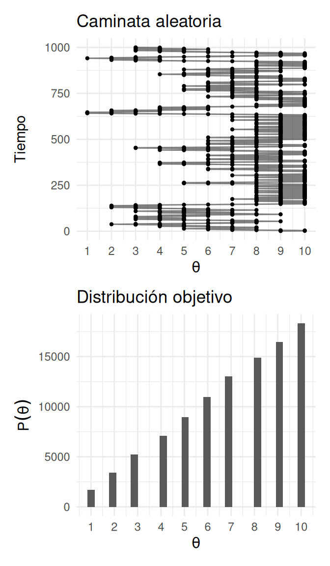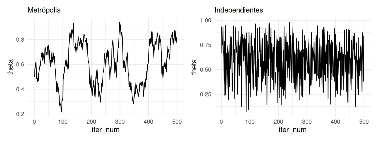 Cuando falla alguna de estas, en el mejor de los casos las cadenas son ineficientes (veremos que requerimos un número mucho mayor de iteraciones), y en el peor de los casos dan resultados sesgados que no son confiables.