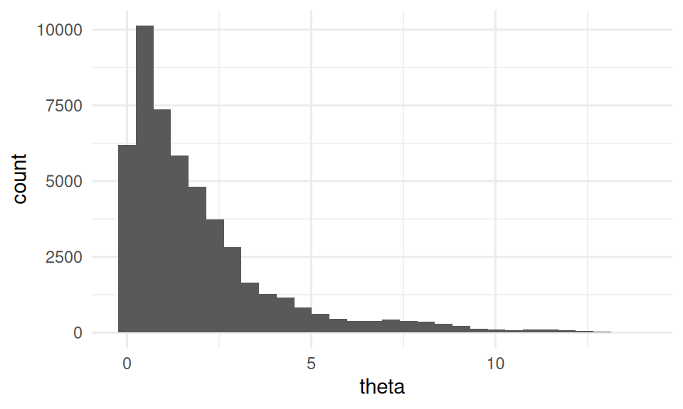 Y podemos aproximar de esta manera cualquier cantidad de interés que esté basada en integrales, como probabilidades asociadas a \(\theta\) o cuantiles asociados. Por ejemplo, podemos aproximar fácilmente \(P(e^{\theta}> 2|x)\) haciendo
