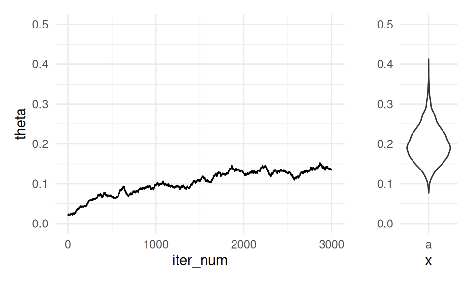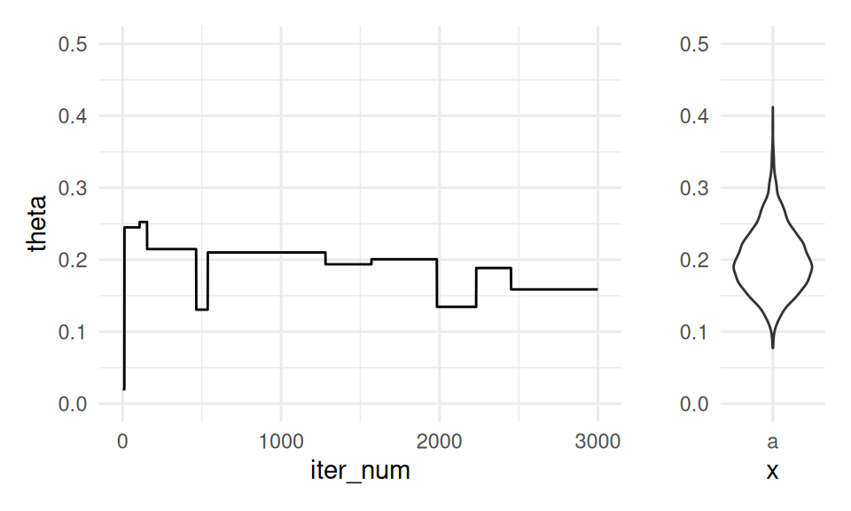 Usualmente nos gustaría obtener un tamaño efectivo de al menos \(100\) (para cálculo de medias y varianzas posteriores). Esta cantidad usualmente se reporta en el software (con mejores estimaciones que la de la fórmula de arriba), y es necesario checarlo.