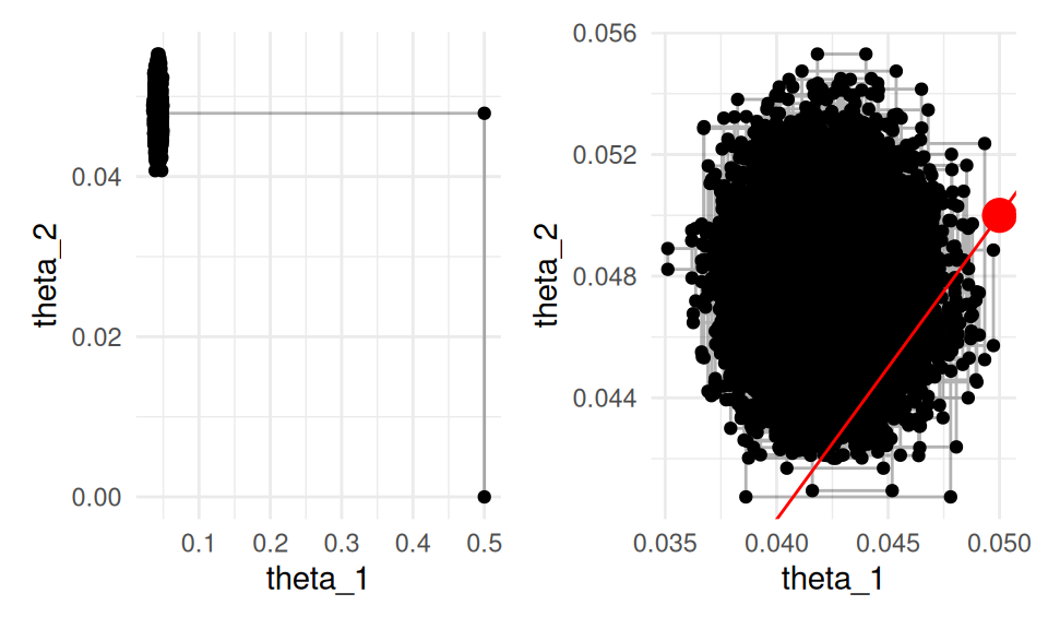 Buscamos entonces que este valor sea cercano a 1. Si es mayor a 1.05, es señal de posibles problemas de convergencia (pocas iteraciones u otras fallas en la convergencia). Si es menor que 1.01, generalmente decimos que “pasamos” esta prueba. Esto no es garantía de que la convergencia se ha alcanzado: la primera razón es que este diagnóstico, por ejemplo, sólo considera media y varianza, de forma que en principio podríamos pasar esta prueba aún cuando las cadenas tengan comportamiento distinto en otras estadísticas de orden más alto (por ejemplo, una cadena que oscila poco y de vez en cuando salta a un atípico vs otra que tiene variación moderada pueden ser similares en medias y varianzas).