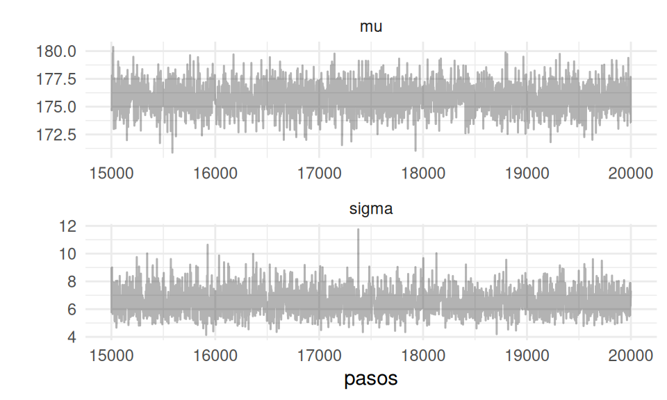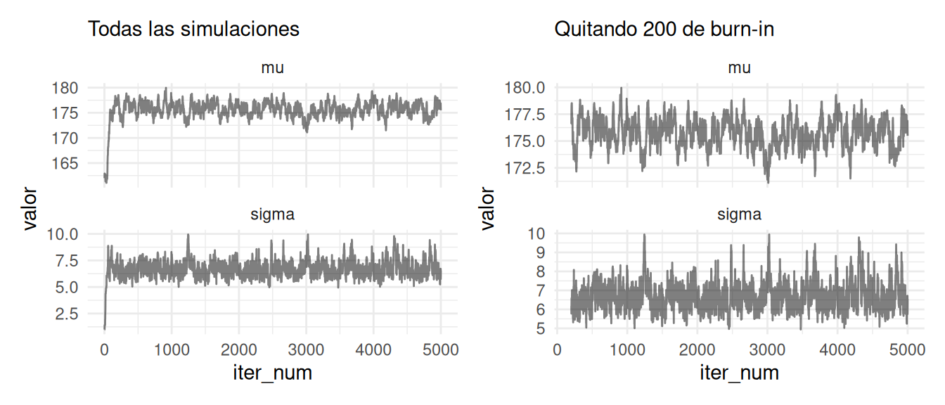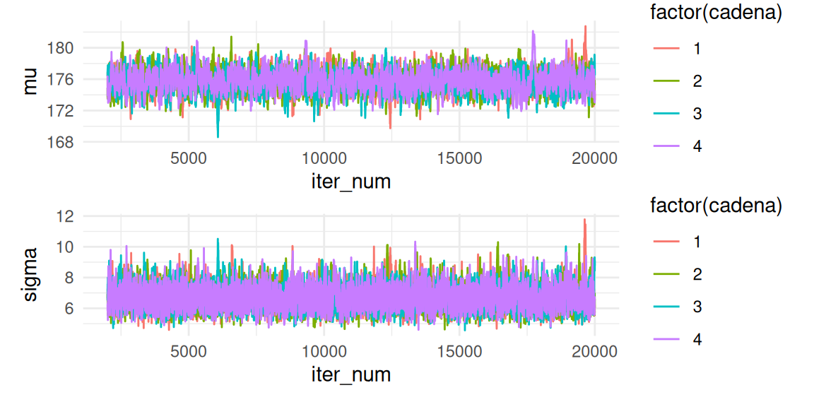Cuando nuestro método de simulación converge a la distribución posterior, esperamos que las cadenas, durante todo su proceso, exploran la misma región del espacio de parámetros.