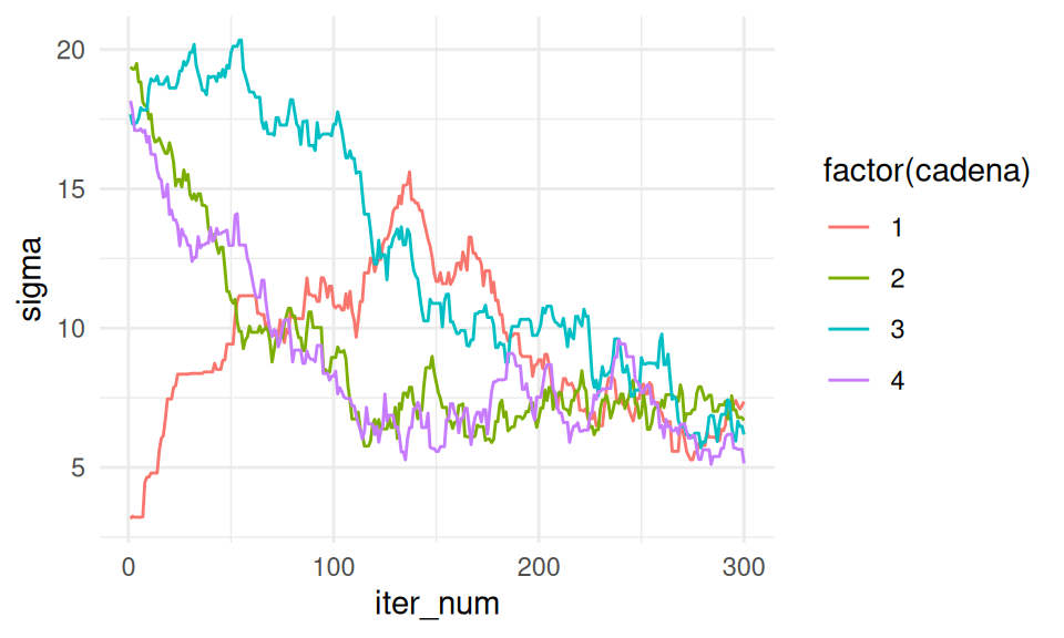 Si las simulaciones no han alcanzado convergencia aumentamos las iteraciones a \(500\) ó \(1000\) de tal forma que las corridas tarden segundos o unos cuantos minutos.