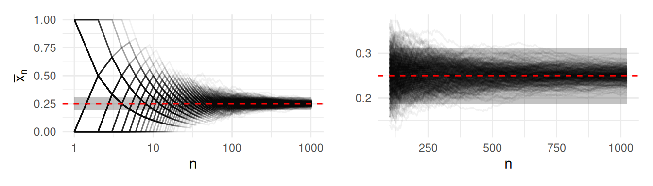 Nota que la banda definida por \(\epsilon\) se puede hacer tan pequeña como se requiera, lo único que sucederá es que necesitaremos un mayor número de observaciones para garantizar que las trayectorias de los estimadores \(\hat p_n\) se mantengan dentro de las bandas con alta probabilidad.
