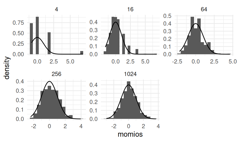 El gráfico anterior valida empíricamente la distribución asintótica para casos de muchas observaciones. A continuación ilustraremos cómo explotar este resultado para obtener intervalos de confianza.
