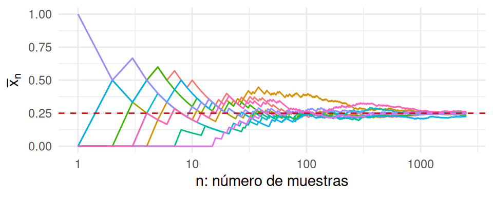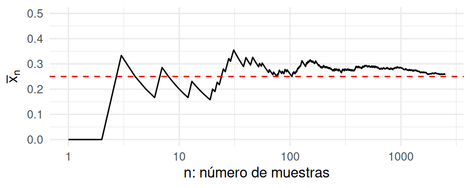 La figura siguiente ilustra el estimador \(\hat p_n\) como función del número de observaciones en nuestra muestra. Podemos apreciar cómo el promedio parece estabilizarse alrededor del verdadero valor de \(p^* = 0.25\) cuando tenemos una cantidad suficientemente grande de observaciones.
